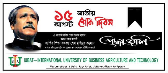আইইউবিএটির উপাচার্য অধ্যাপক ড.আবদুর রবের সভাপতিত্বে জাতীয় শোক দিবস উপলক্ষ্যে বিকাল ৪টায় এক বিশেষ ভার্চুয়াল আলোচনা অনুষ্ঠান এবং দোয়া মাহফিলের আয়োজন করা হয়। এতে আরো উপস্থিত ছিলেন কোষাধ্যক্ষ অধ্যাপক