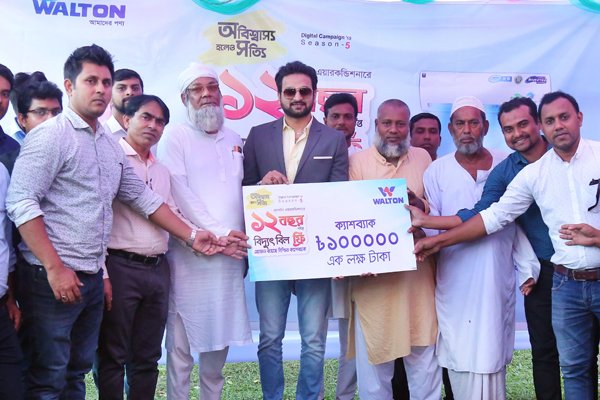 রবিবার আনুষ্ঠানিকভাবে শাহজাহানের হাতে ১২ বছরের বিদ্যুৎ বিল তুলে দেন চিত্রনায়ক সাইমন সাদিক। এ সময় অন্যদের মধ্যে উপস্থিত ছিলেন টোক ইউনিয়ন পরিষদ চেয়ারম্যান শরীফ ওয়াহিদ, সাবেক ইউনিয়ন পরিষদ সদস্য হাজী চানু মিয়া এবং ওয়ালটনের ডেপুটি অপারেটিভ ডিরেক্টর মীর মোহাম্মদ গোলাম ফারুক প্রমুখ।ক্রেতা শাহজাহান জানান, বীর উজালী বাজারে তার ডিমের আড়ত আছে। সম্প্রতি সেখানে একটি অফিস করেছেন। তার জন্য টোক বাজার ওয়ালটন প্লাজা থেকে ৩টি দেড় টনের এসি কেনেন। এরপর ডিজিটাল ক্যাম্পেইনে রেজিস্ট্রেশন করলে ১২ বছরের বিদ্যুৎ বিল ফ্রি পাওয়ার মেসেজ যায় তার মোবাইলে।