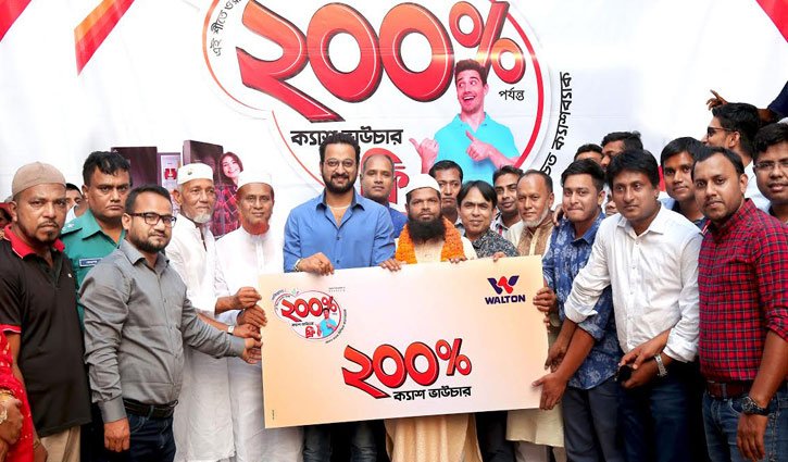 হবিগঞ্জের শওকত আলীর হাতে ক্যাশ ভাউচার তুলে দিচ্ছেন নায়ক সাইমন সাদিক এবং ওয়ালটনের নির্বাহী পরিচালক এমদাদুল হক সরকারসহ অন্যরাওয়ালটনের নির্বাহী পরিচালক এমদাদুল হক সরকার বলেন, ‘বাংলাদেশের ঘরে ঘরে ওয়ালটন পণ্য। তাই বলা যায় বাংলাদেশের সব মানুষ ওয়ালটন পরিবারের সদস্য। স্থানীয় বাজারের পাশাপাশি সারা বিশ্বে বাংলাদেশে তৈরি ওয়ালটন পণ্য ছড়িয়ে দিতে ব্যাপকভাবে কাজ চলছে।’