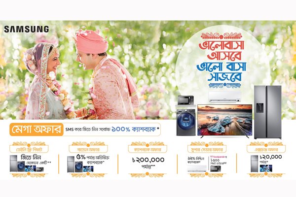 নতুন সংসার সাঁজাতে নবদম্পতি সবচেয়ে বেশি গুরুত্ব প্রদান করে প্রয়োজনীয় হোম অ্যাপ্লায়েন্স ক্রয়ে। আর নববিবাহিতদের এই চাহিদার বিষয়টিকে গুরুত্ব দিয়ে টিভি, রেফ্রিজারেটর, ওয়াশিং মেশিন এবং মাইক্রোওয়েভ ওভেন কেনার ক্ষেত্রে বিশেষ অফার নিয়ে এলো স্যামসাং। এই ক্যাম্পেইনের আওতায় ক্রেতারা যেকোনো স্যামসাং হোম অ্যাপ্লায়েন্স কিনলেই জিতে নিতে পারেন টিভি, রেফ্রিজারেটর, ওয়াশিং মেশিন কিংবা মাইক্রোওয়েভ ওভেন। এক্ষেত্রে স্বয়ংক্রীয়ভাবে মোবাইলে এসএমএস-এর মাধ্যমে বিজয়ীদের নির্বাচন করা হবে।